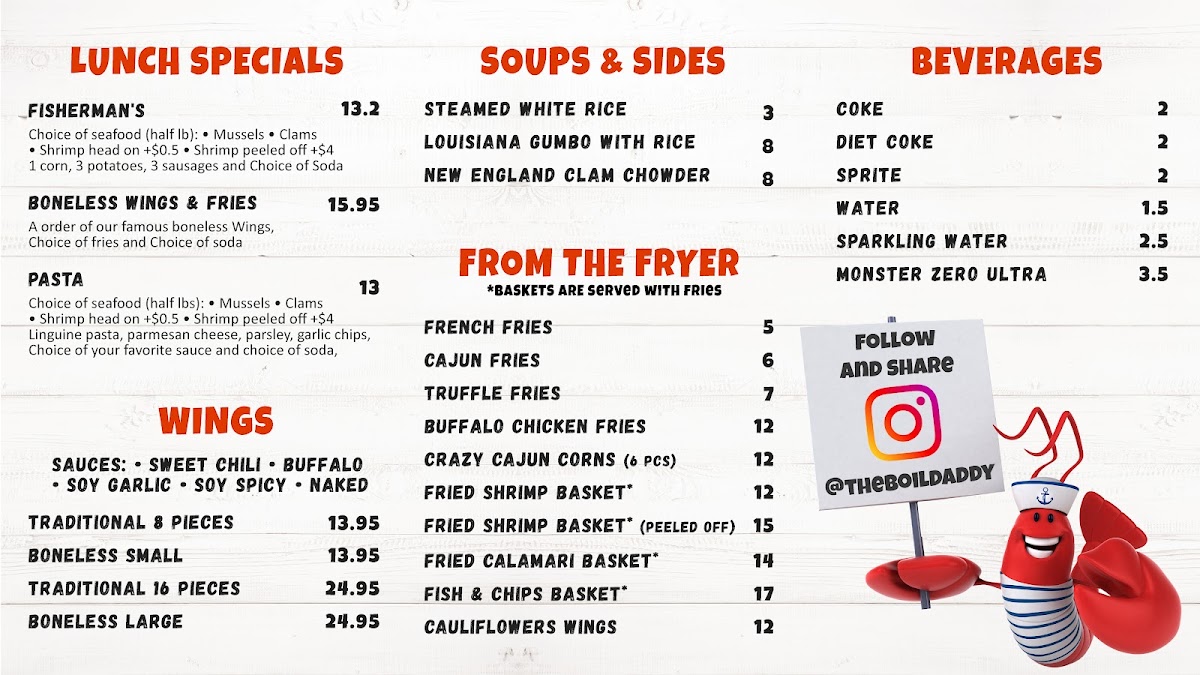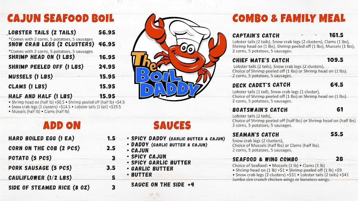 Boil Daddy - Inglewood offers a delightful selection of seafood and comfort food, perfect for anyone craving a flavorful, hearty meal. Their World Famous Daddy's Catch is a standout, featuring options like Shrimp Head-On, Shrimp Peeled-Off, Crawfish (Frozen), Clams, and Mussels. For those looking to enjoy a variety of flavors, the Daddy's Family Feast provides several combo options such as Captain's Catch Combo, Chief Mate's Catch Combo, and Boatswain's Catch Combo, each offering an array of seafood favorites. The Daddy's All Day section brings comfort dishes like Daddy's Shrimp Bowl, Daddy's Noods, and Fisherman's Lunch, along with crispy choices like Crispy Mahalo Shrimp and Crispy Mahalo Fish. For wing enthusiasts, the Daddy's Wings offers different styles, from Wet Daddy Wings to Sweet Chili Wings. The Po'Boy sandwiches are a must-try, with options including Fried Shrimp Po'Boy, Fried Fish Po'Boy, and Fried Chicken Po'Boy. To complement your meal, they offer Daddy's Extra items like Corn On The Cob (2 Pcs) and Garlic Butter Sauce. Don't forget to end your meal with something sweet, like Sugar Daddy Churros. The beverage selection includes classic soft drinks like Coke, Sprite, and Diet Coke, along with bottled water for a refreshing drink. Whether you're looking for a filling feast or a quick snack, Boil Daddy's menu caters to all tastes with its mix of seafood and savory sides.
